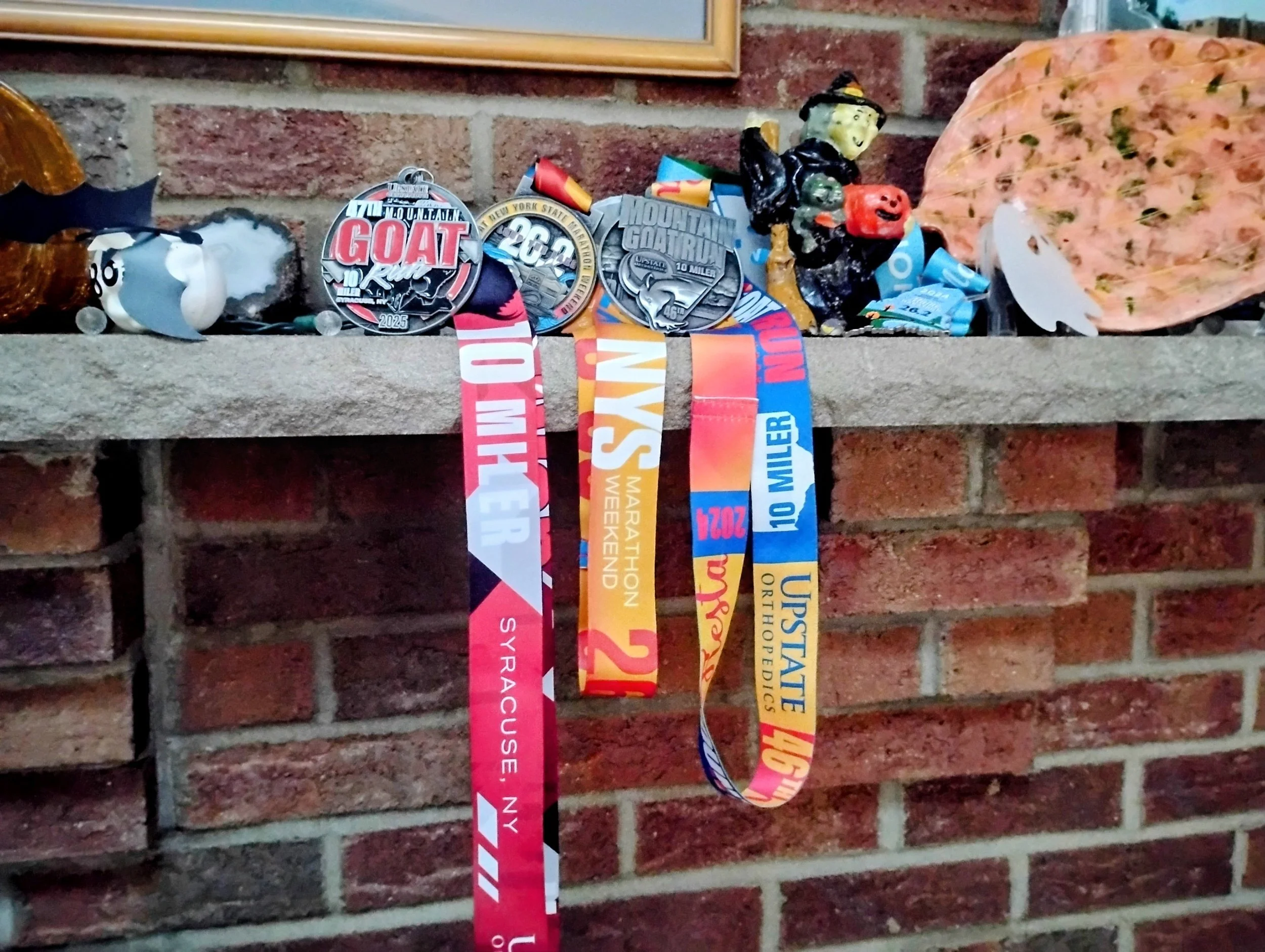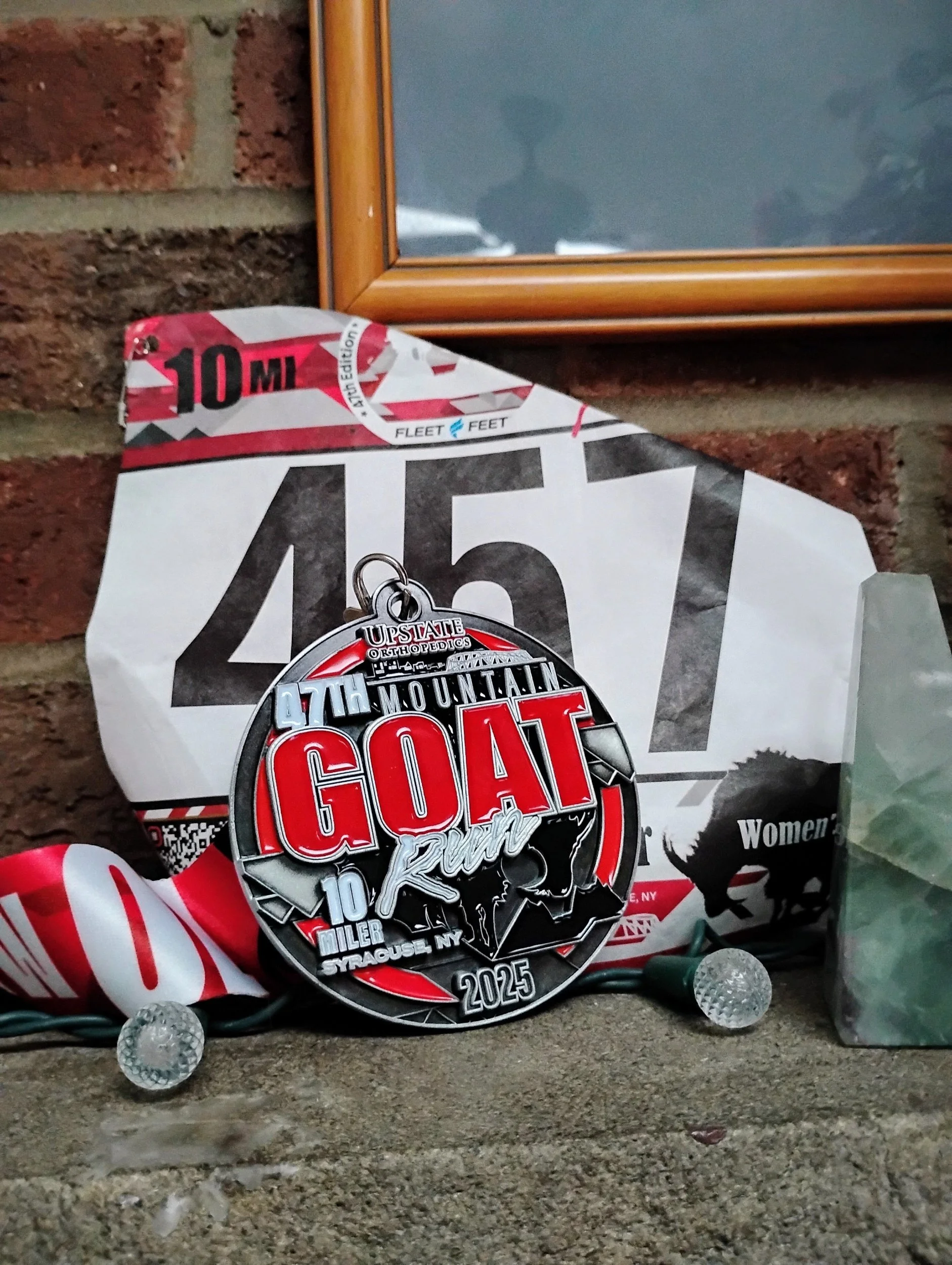 Loud music, with my disciplined springing legs took me to the familiar final stretch, with my increased speed making me feel powerful as I crossed the finish line, quickly switching from super serious to a smile of pure joy before holding my glamorous Maine Marathon Medal shaped as the actual state.
